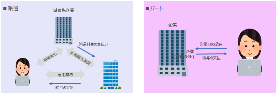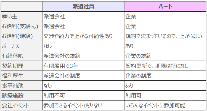 「派遣」と「パート」の比較表