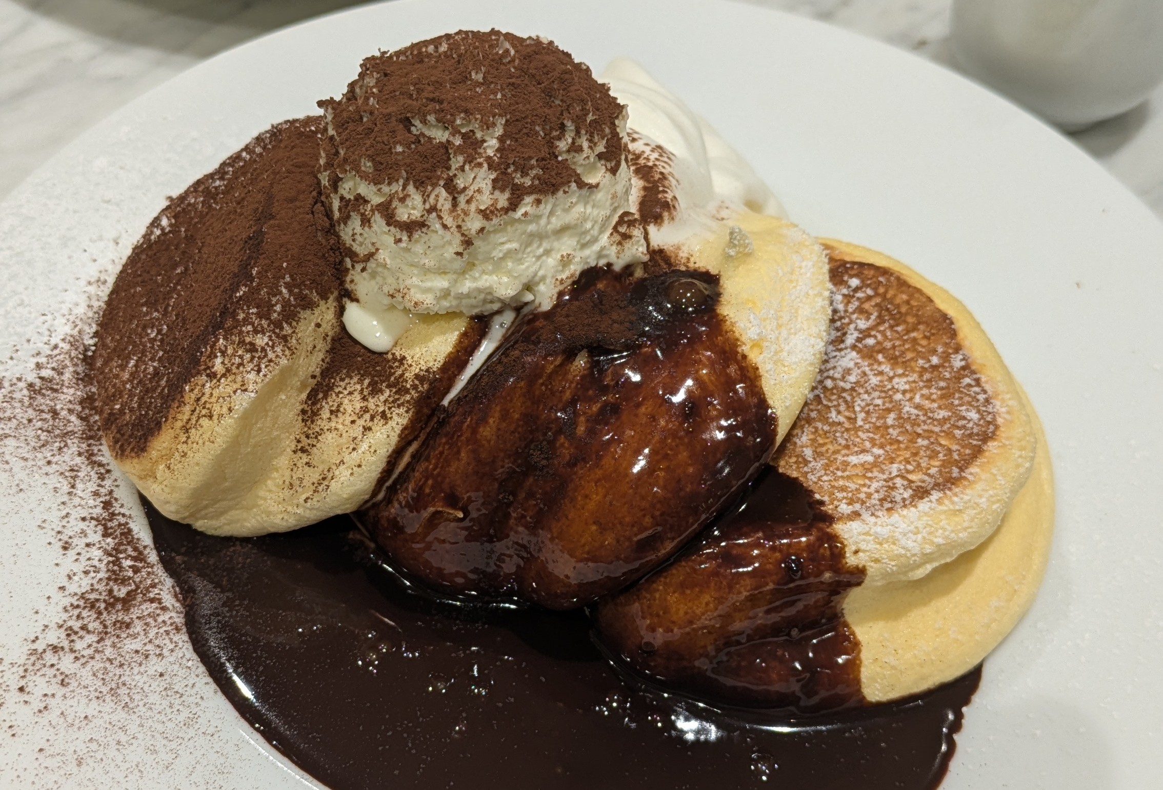 今回は、ティラミスパンケーキを注文。濃厚チーズムースパンケーキベリーソースと迷いに迷って、ティラミスにしました。上にのっているのはアイスや生クリームではなく、クリームチーズで、エスプレッソもお好みでかけて食べてくださいと言われ、初めはそのまま食べたのですが、エスプレッソをかけるとティラミスの味が濃厚になってとってもおいしかったです。写真では隠れてしまいましたが、生クリームも添えられています。
